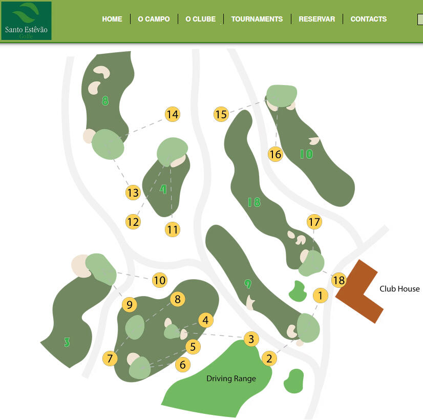 Santo Estevao is a large golf course community located in Santarem. They have a 6382 meter 18 hole par 73 course and a driving range with about 20 bays, 6 of which are covered. They also advertise an 18 hole pitch and putt course.It turns out that the pitch and putt course is a series of turf mats strategically placed next to some of the greens that comprise the 18 hole course. Looking at the map on the right, the numbers circled in yellow are the starting positions for the 18 pitch and put holes. The green numbers are the subset of holes from the 18 hole course that are also used for pitch and putt. If you look more closely at the map, you'll see that you will play each of the green locations twice. For example, shots from the first and second pitch and putt location will both land on the green of the 9th hole. Yes, this was originally confusing to me as well! I was advised that if someone is playing on the 18 hole course they have priority, but luckily I was out on the course by myself today.It took me about 2 hours and 2.4 miles (3.9 km) of walking to complete the 18 pitch and putt holes. The hole distances ranged from 43 to 92 meters and included sand traps and trees as obstacles. Overall, it was a fun course to work on my short game and is likely a good course for beginners looking to transition from practicing on the range to the course. However, I would have had reservations about playing if the 18 hole course was busy as it was hard enough to find my holes without having to worry about getting hit by another golfer's shot from the regular 18 hole course tee boxes. The cost was €22 for members of the FPG and €35 for the general public.
